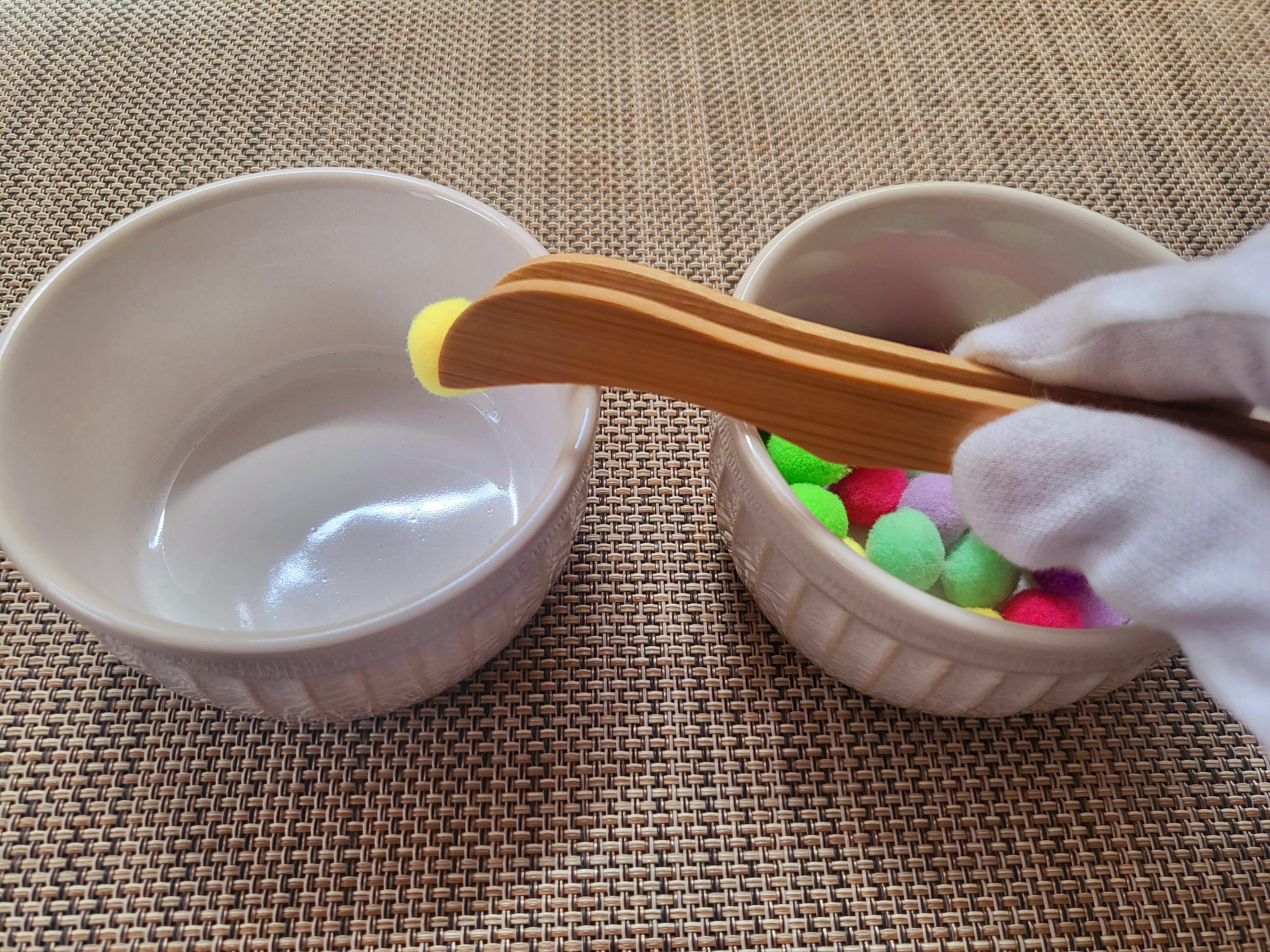 小さいポンポンから始めて、できるようになったら、今度は指の力をもっと使いぎゅっと握らないと掴めない大きいポンポンに変えて難易度を上げましょう。